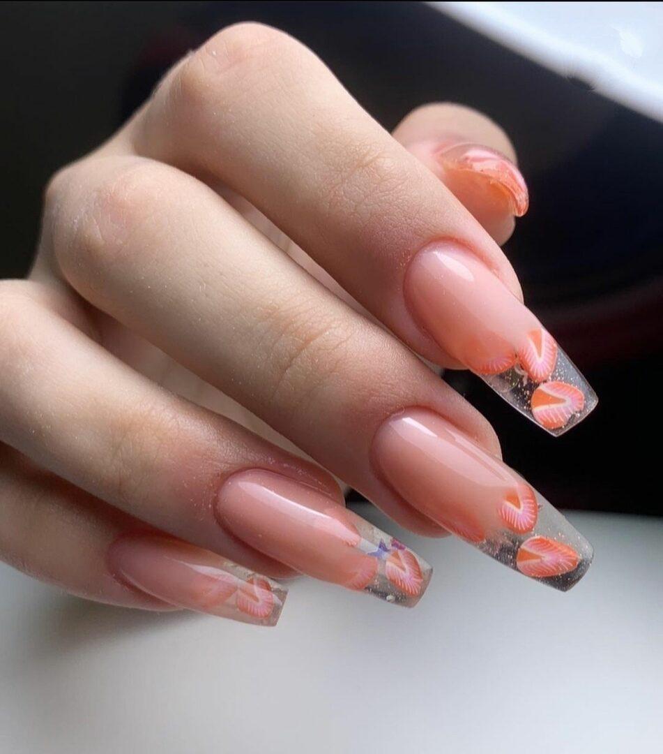 - Персиковый — главный цвет 2024 года по версии Pantone, поэтому мы его увидим во многих идеях летнего маникюра.