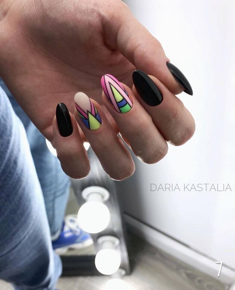 - техника «color block», при которой несколько сегментов различной геометрической формы и размеров заполняются 4-6 гармонично подобранными колерами. Границы вырисовывают нейтральным лаком, чаще всего – черным, а также глиттером или мелкими кристаллами. Такой стиль великолепно сочетается с техникой «разные руки», так как монохромное покрытие на одной ручке смягчает буйство оттенков;