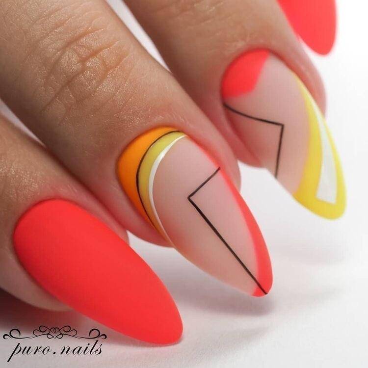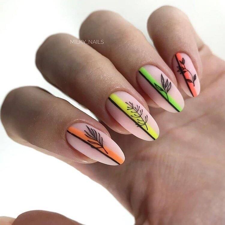 Выполнить цветной маникюр очень просто, а выглядит очень эффектно. Такие ногти поднимают настроение самому владельцу и заряжают энергией окружающих. Тропический маникюр снова в моде. Вариант такого дизайна ногтей подойдет для отдыха не только на море. Геометрия — модный дизайн для рук и ног. Есть много идей для таких тем. Цвета и оттенки могут быть разными, яркие кричащие лаки и слегка нежные, при правильном сочетании любая палитра идеально смотрится на ногтях.