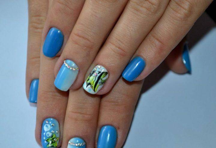 - для отпуска мастера советуют оформить ноготки в расслабляюще-заводном стиле, используя морскую, пляжную тематику. На пластинках рисуют: коктейли; тропические острова; яхты и ракушки. А также абстракции, напоминающие морские глубины, пенные волны;