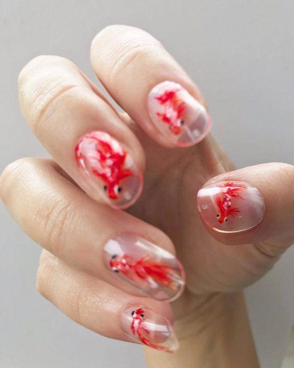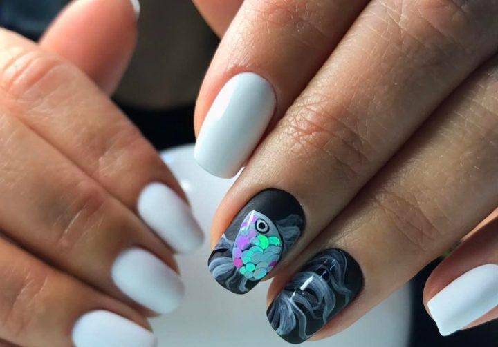 Рыбный маникюр — это прекрасная идея для летнего отдыха на море. Он является альтернативой стандартному морскому дизайну, который не уступает ему в яркости и оригинальности. Рыбки можно изобразить в стиле минимализм, сделать более детальный и реалистичный рисунок, а также использовать стразы и пайетки.
