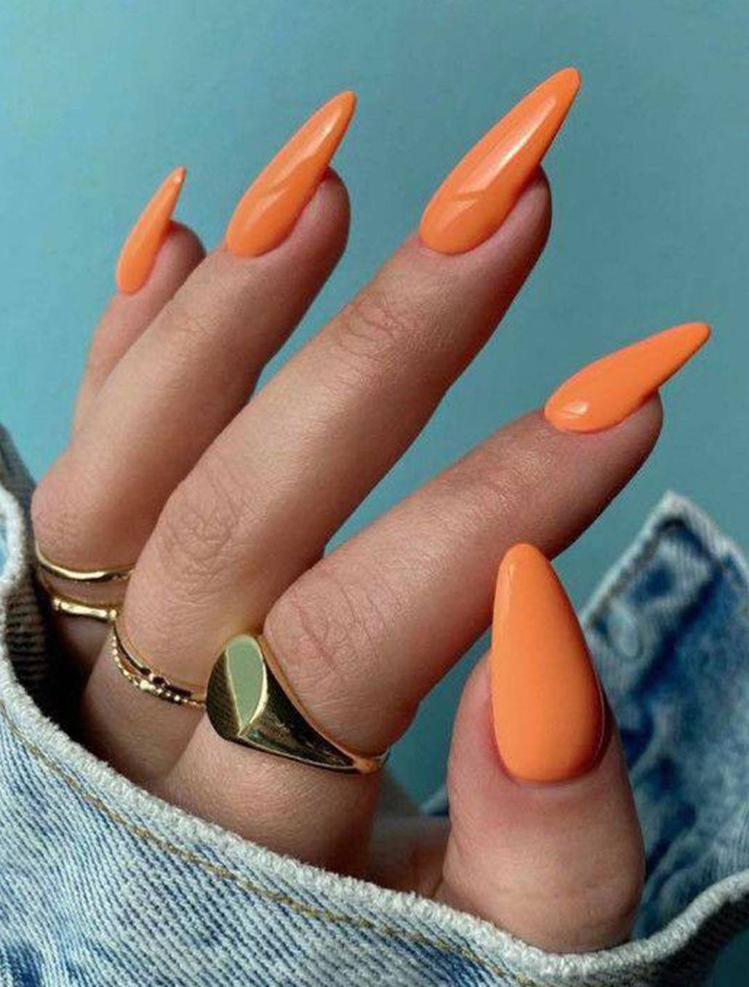 Этот мягкий цвет входит в модные новинки 2022 года. Это светлый и невероятно красивый оттенок, который сделает ваш маникюр интересным. Оранжевый всегда ассоциируется с позитивом и теплом, он отлично дополнит ваш летний образ. Попробуйте добавить рисунки в виде апельсинов или пальм. Будет выглядеть очень здорово и привлекательно.