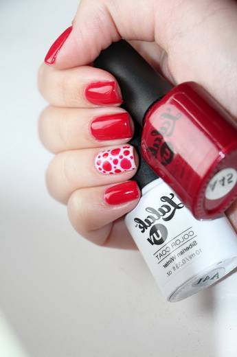 Сочетание подобного узора и ярких оттенков лака очень свежо и необычно смотрится на ноготках. Такой дизайн можно выполнять в одном цвете лака или сразу нескольких. Очень впечатляют лимонные, оранжевые, мятные, насыщенно-красные и яркие малиновые покрытия. Пятнышки могут быть расположены на всех ногтях или на одном в качестве интересного акцента.
