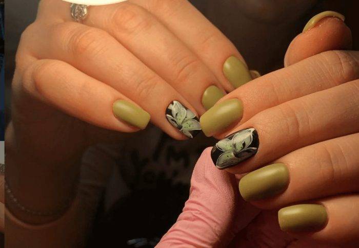 Актуально будет добавить рисунки геометрических фигур, птичек или белый горошек. Невероятно красивый дизайн можно получить, если покрыть все ногти матовым лаком, а на безымянный палец и мизинец нанести блестки. Такое оформление ноготков сегодня можно часто увидеть на фото голливудских звезд.