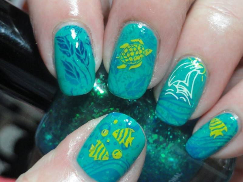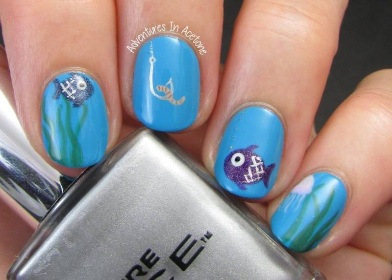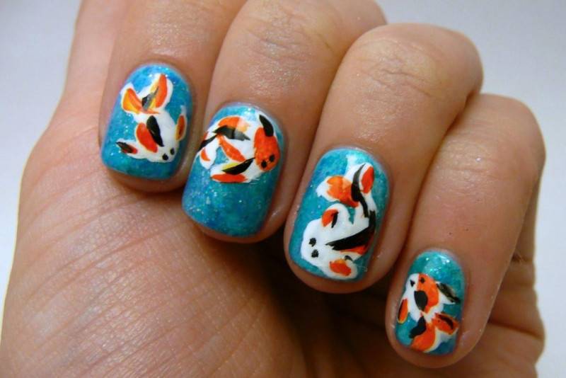 Рыбный маникюр на ногтях — лучший вариант для дизайна летних ноготков в морском стиле. Выполняется в синем или зеленом цветах. Изображают рыбку тонкой кистью или используют стикеры. Безусловное украшение нейл-дизайна — сказочная золотая рыбка. Он бывает желтого или оранжевого оттенка, украшен стразами, блестками, цветной фольгой.