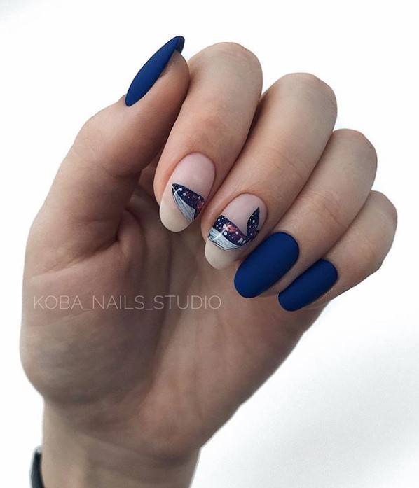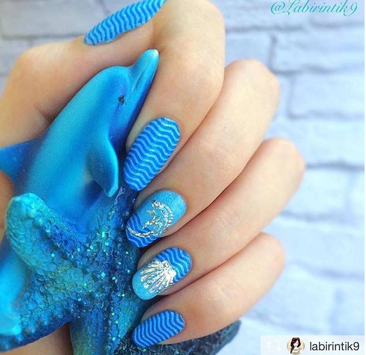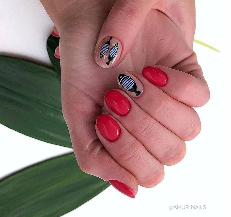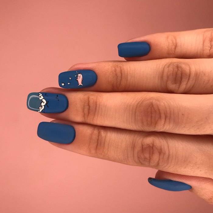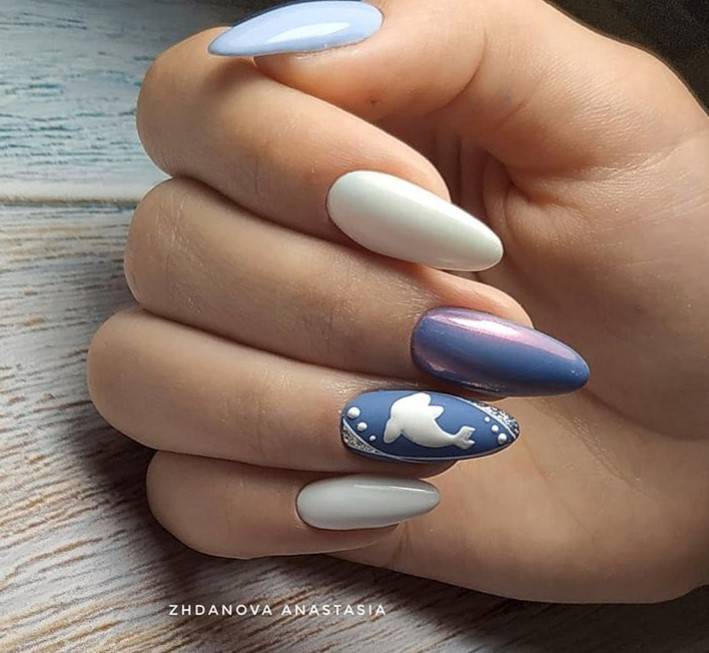 На акцентный ноготь можно наклеить изображение золотой рыбки. Все остальные пальцы покройте синим или белоснежны лаком. Эффектно будет смотреться нарисованный кистью дельфин или синий кит.