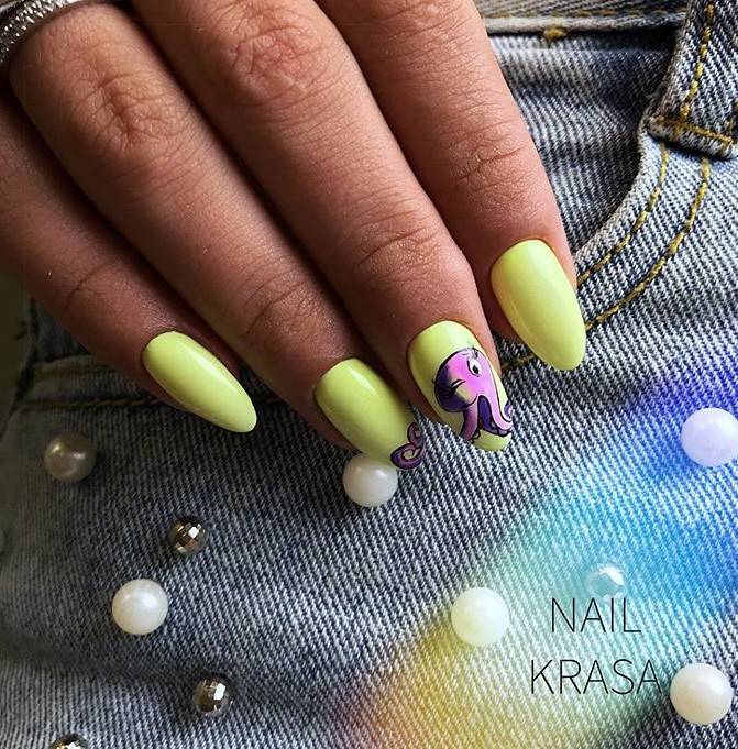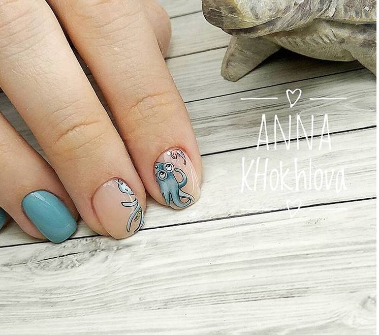 Маникюр омбре лучше всего подходит для рисования осьминога на ногтях. Ее образ не отличается особой сложностью, поэтому он выполнится в домашних условиях тонкой кистью. Девочки предпочитают изображать забавных мультяшных осьминогов, украшая их серебряными или золотыми красками или цветной глянцевой фольгой.