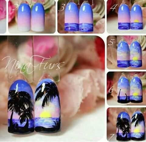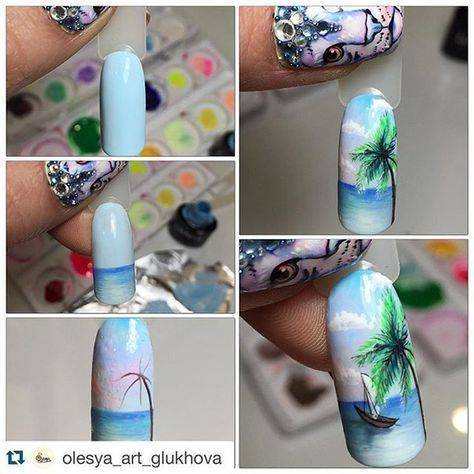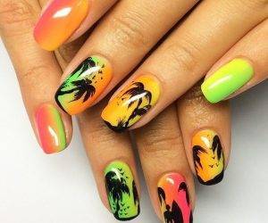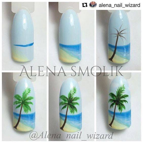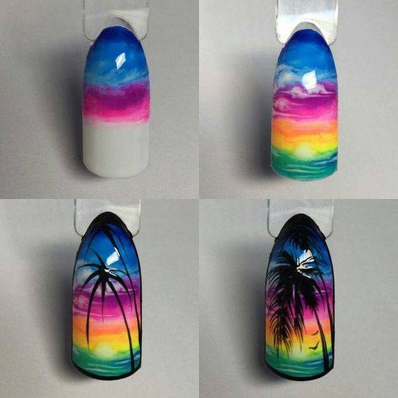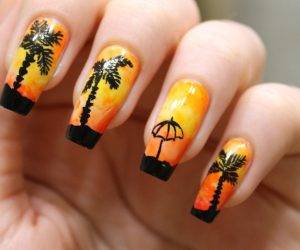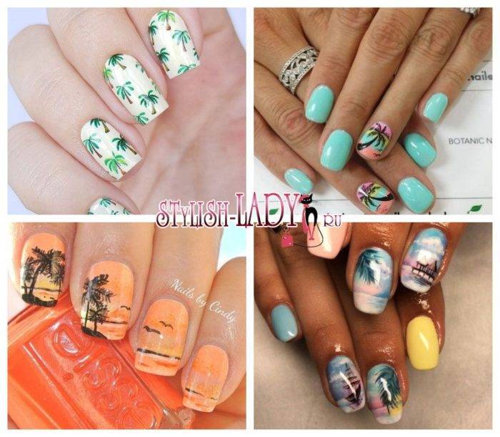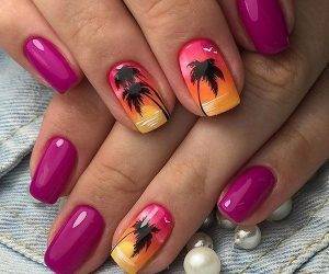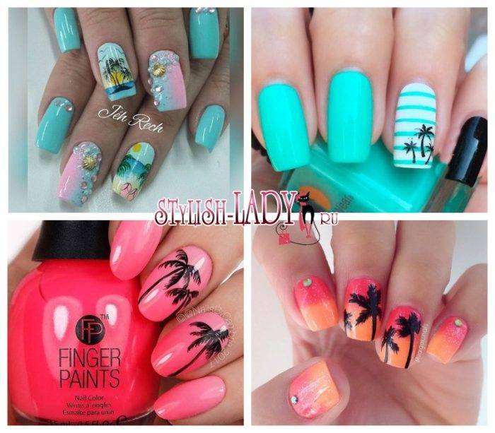 Совет: если рисовать пальмы никак не получается, а с созданием основы никаких проблем нет, стоит поискать переводные картинки для маникюра. Они же называются наклейками для ногтей или слайдерами. Их можно просто приклеить поверх застывшего лака, нанести сверху блеск или финиш и получить желаемый эффект без труда.