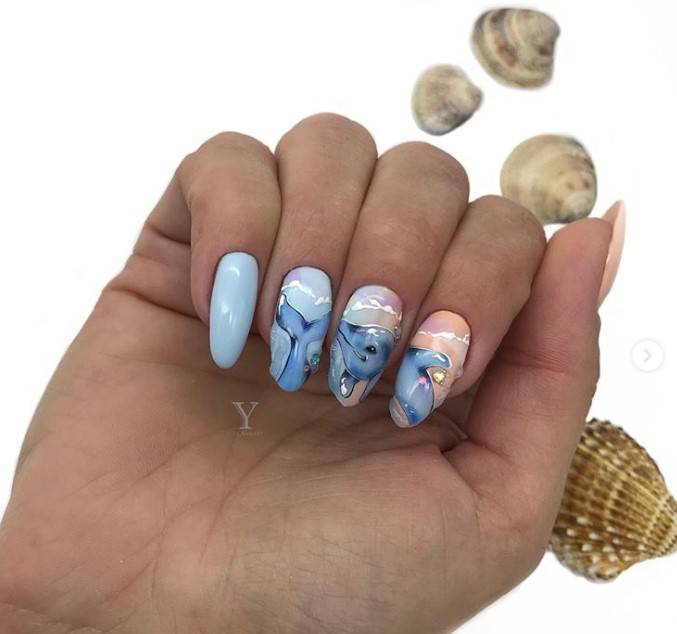 Мастера нейл-дизайна недавно предложили изображение этого морского зверя на ногтях, и оно сразу покорило сердца модниц. Кит, выпускающий фонтан наверху, всегда вызывает умиление. Изображается на любой цветовой основе, в большинстве случаев это голубой, бирюзовый или голубой цвет.