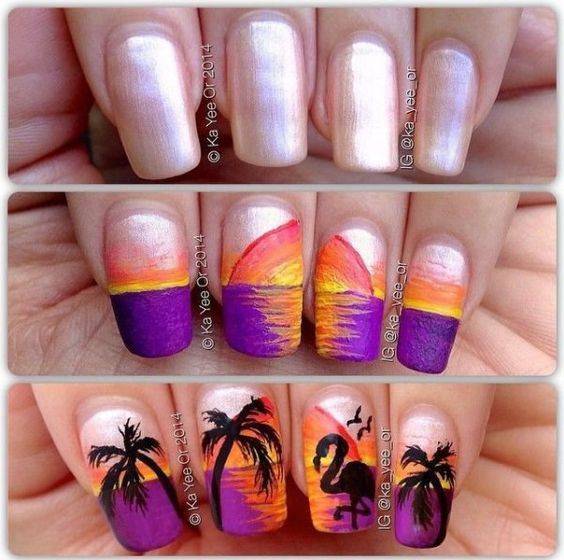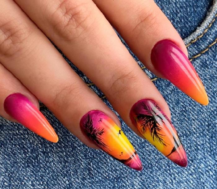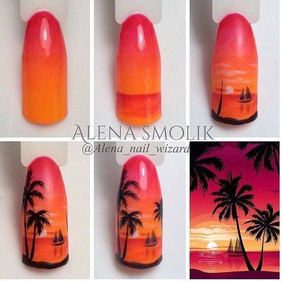 Можно сделать изображение заката в технике омбре. Плавный переход от одного цвета к другому придаст вашему маникюру оригинальности и яркости.