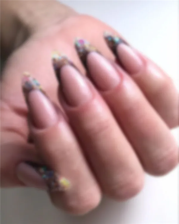 - В некоторых случаях есть необходимость немного разнообразить дизайн и нанести на кончик ногтей блестки или глиттер, к примеру, красный или оранжевый, все зависит от личных цветовых предпочтений.