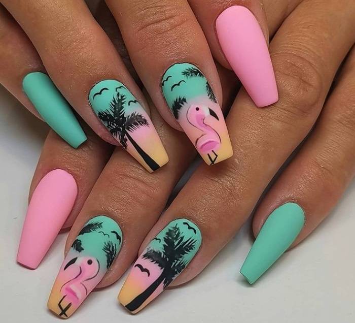 Для обладательниц длинных ноготков подходит любой рисунок, а вот, те, у кого они короткие, часто не решаются на сложное оформление. Но дизайн ногтей с пальмами будет отлично подходить к любой длине.