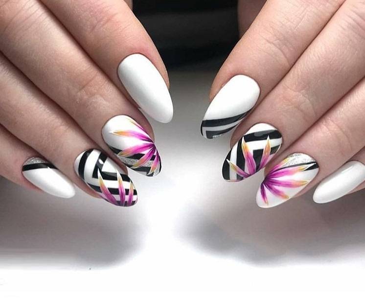 Круто смотрится маникюр в черно-белых тонах с полосками разной толщины — получится рисунок с эффектом Доплера. Можно сделать матовые разноцветные полоски, чтобы твой дизайн ногтей точно был оригинальным. Плюс ко всему, с ним можно будет сделать красивые фото в Instagram.