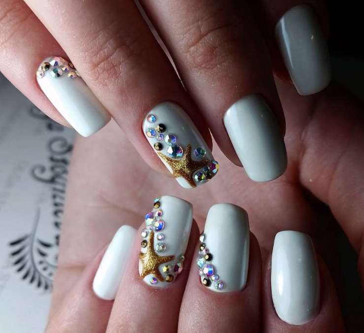 В тренде текущего сезона маникюр с морскими звездами. Техники выполнения этого вида маникюра очень разнообразны, как и фон для такой модели. Звезду можно изобразить в морской глубине на синем или лазурном фоне, или на песке с желтым или золотым. Их можно нарисовать на ногтях, а можно оформить стразами или сделать скульптуру.