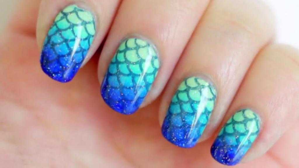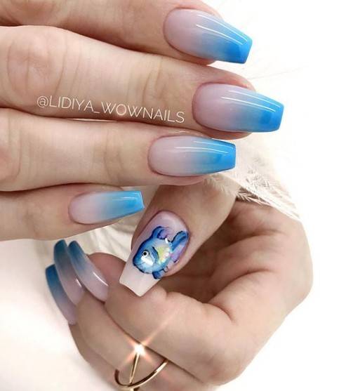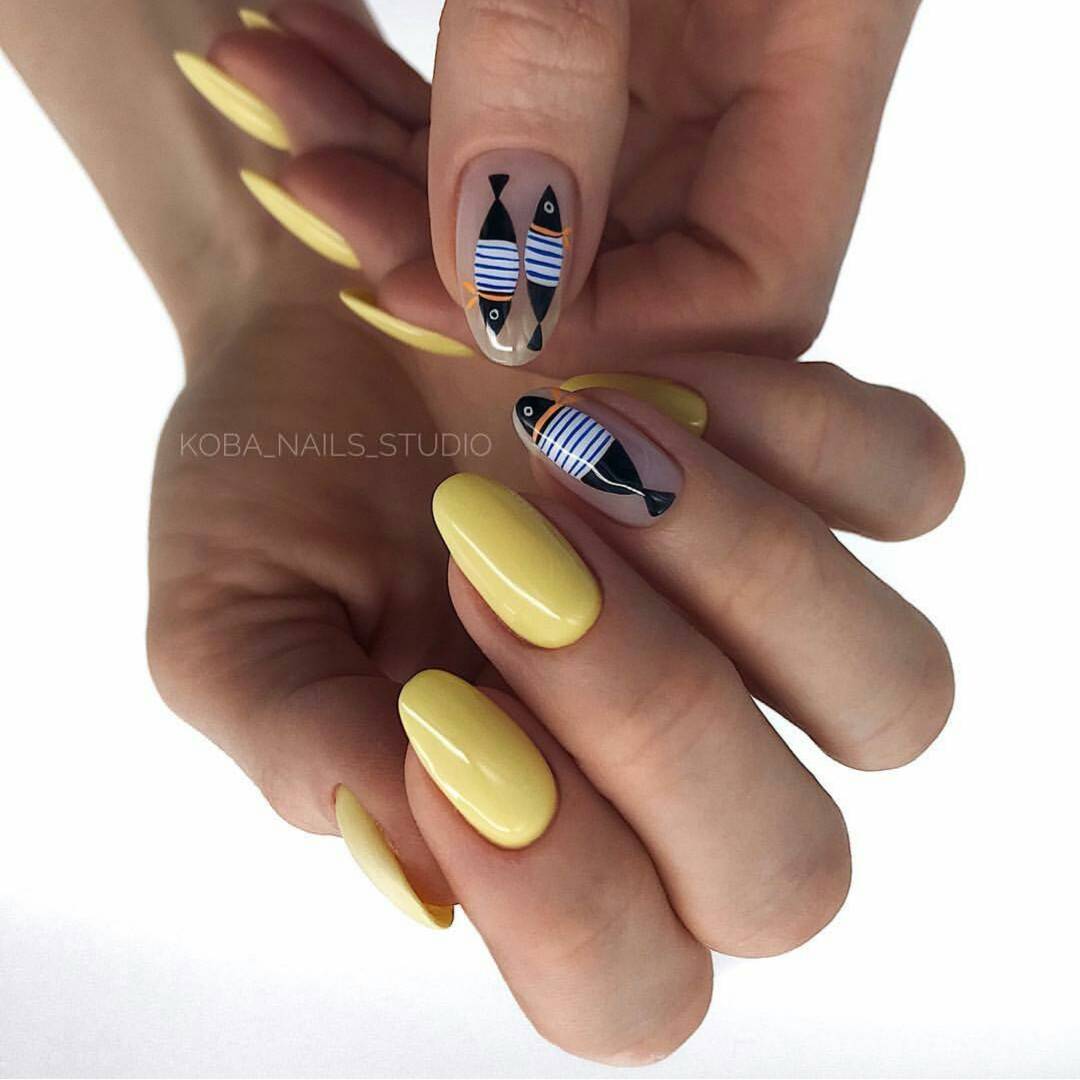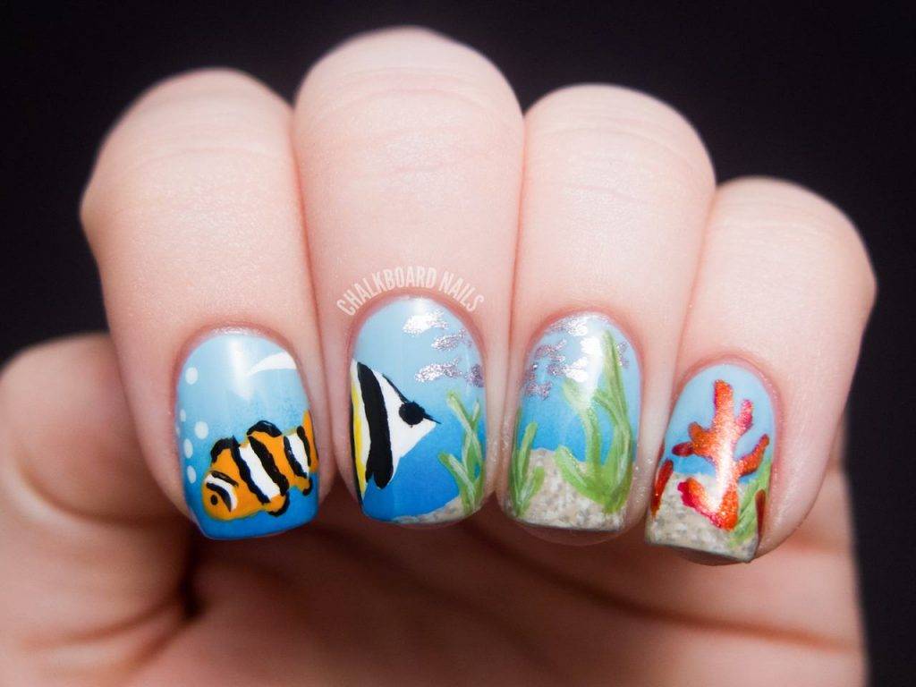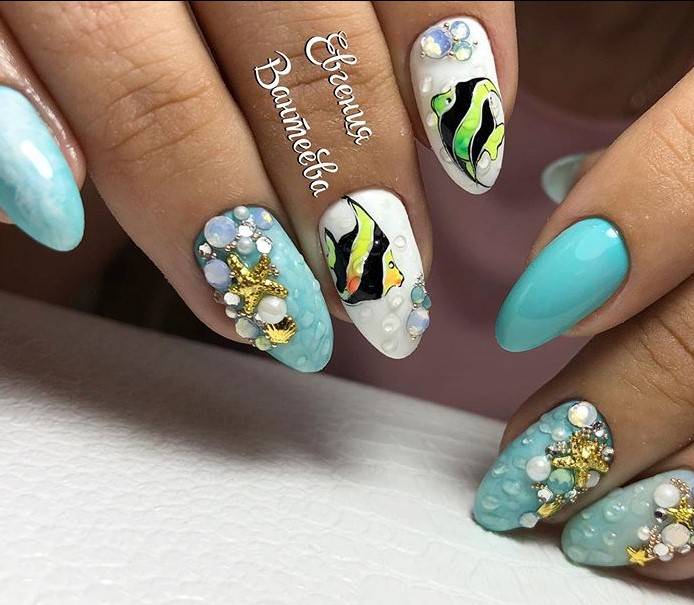 Рыбный маникюр на ногтях — лучший вариант для дизайна летних ноготков в морском стиле. Выполняется в синем или зеленом цветах. Изображают рыбку тонкой кистью или используют стикеры. Безусловное украшение нейл-дизайна — сказочная золотая рыбка. Он бывает желтого или оранжевого оттенка, украшен стразами, блестками, цветной фольгой.