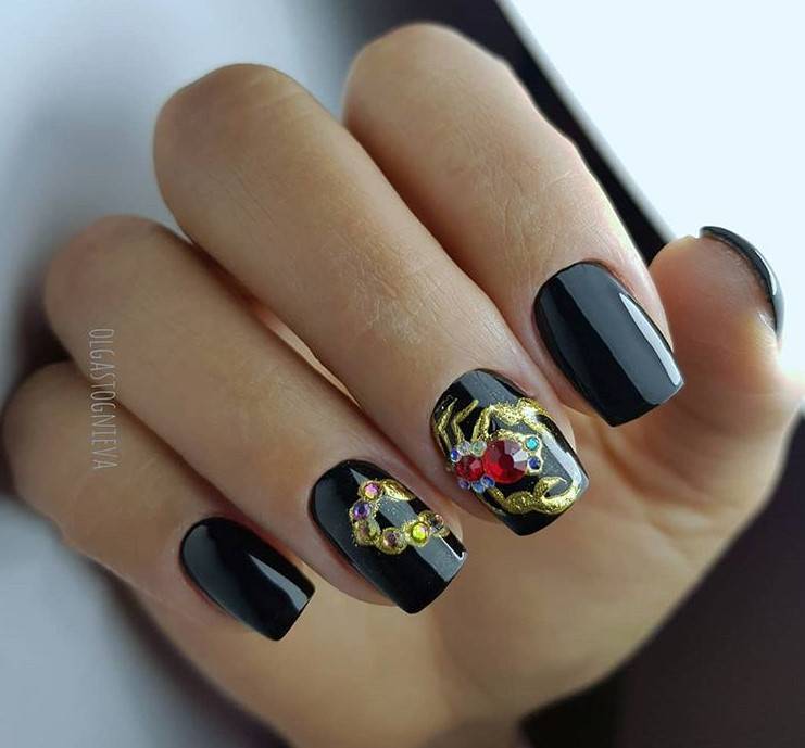 Чаще всего выбор изображения скорпиона на ногтях отдают предпочтение женщинам, рожденным под этим знаком зодиака. Рисунок получается довольно длинным и его целесообразнее выполнять на длинных ногтях. Оригинально смотрится изображение, выполненное со стразами на ногтях, покрытых насыщенными или темными оттенками — винным, бордовым, темно-фиолетовым или черным.