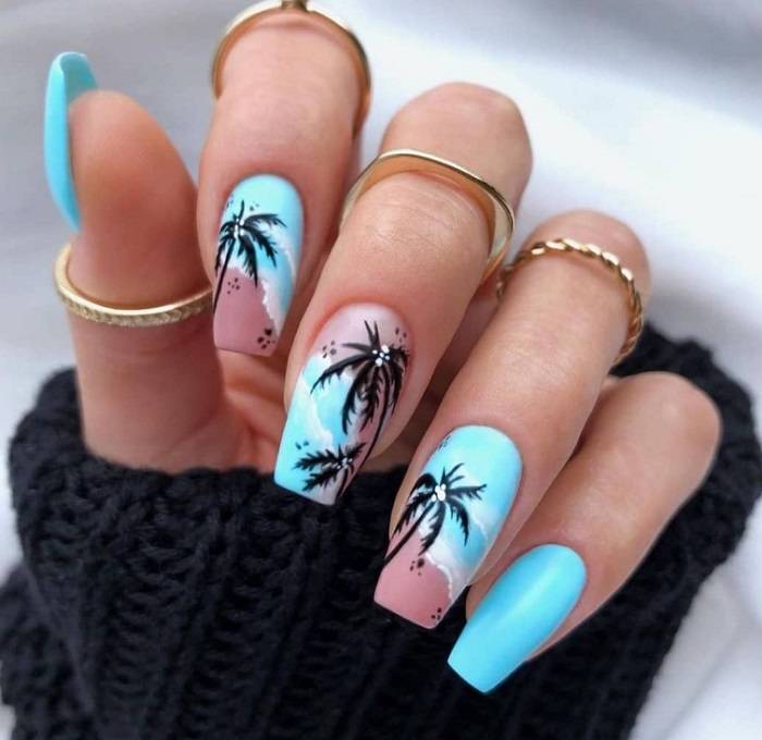 Маникюр на отпуск на море может быть не только легким в голубых тонах, но и ярким. Отличный вариант – это изображение пальм.