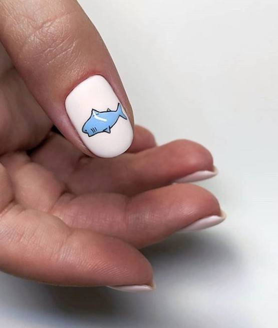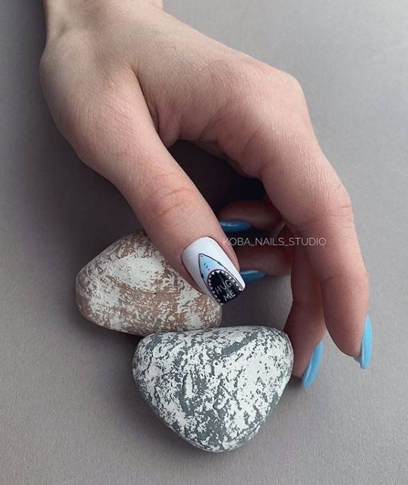 Образ коварного обитателя акульего дна изображают отважные девушки. Раскрытая зубастая пасть или изображение всего силуэта хищника выполняется как в устрашающих вариантах, так и в образе забавных героинь мультфильмов. Модным направлением этого дизайна стало сочетание изображения акулы на одном из ногтей и надписи на другом ногте.