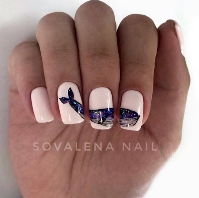 Однако необычайной красоты и оригинальности маникюр достигается за счет изображения бело-голубой фигуры кита на бежевой основе и разделения ее между ногтями соседних пальцев.