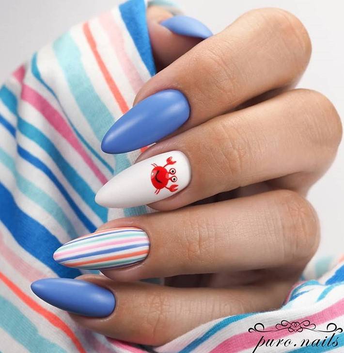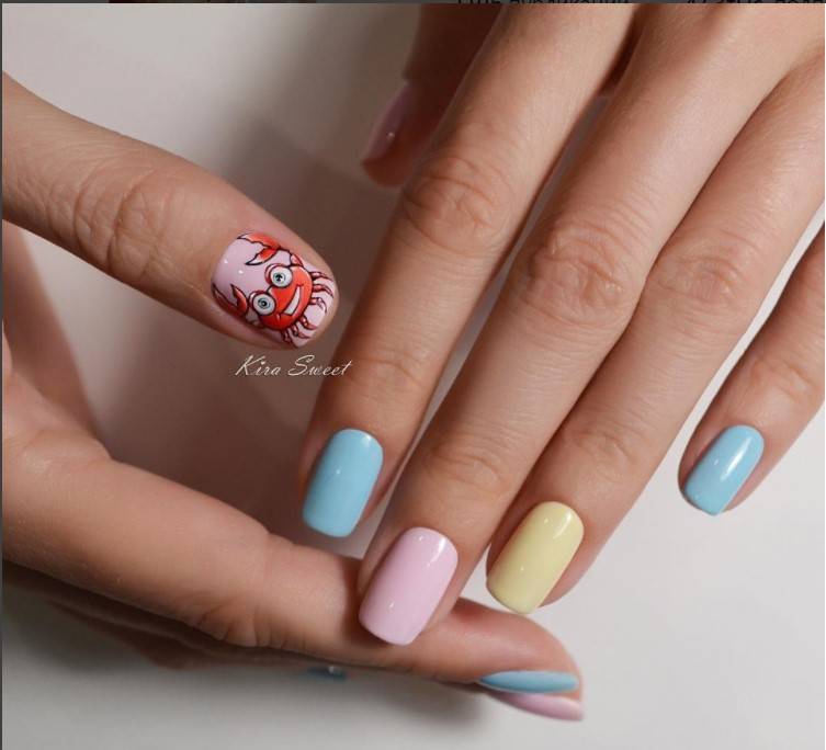 Забавно и оригинально смотрится милый крабик на ногтях. Глядя на него, вспоминаешь счастливые дни отдыха на море и маленьких крабов, которые бегали между трещинами в скалах. На рисунках крабы расписаны густым гель-лаком. Рисунок не сложный и его можно сделать дома самостоятельно. Вы также можете облегчить себе работу и использовать стикеры.