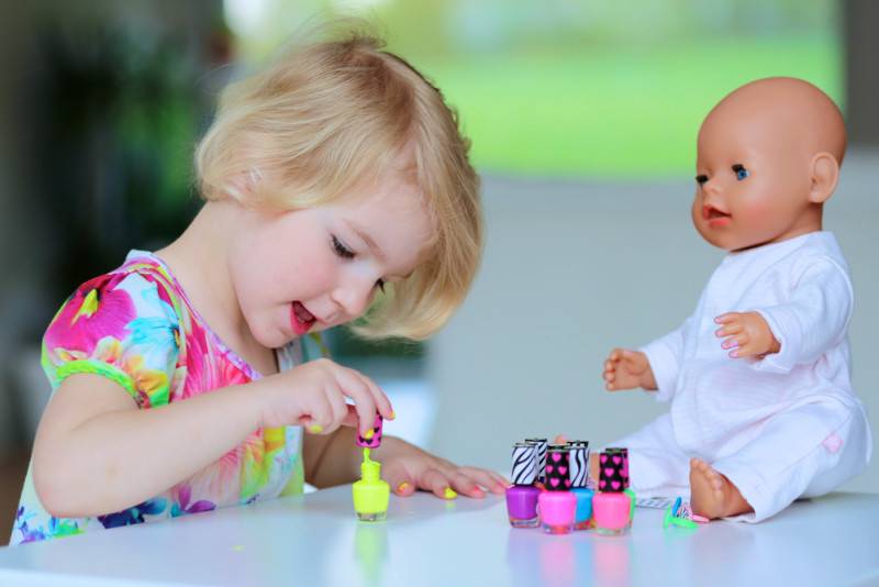 Скорее всего, девочку не придется уговаривать на домашний уход за ногтями, ведь она наблюдает за мамой и хочет подражать ей. Девочка с удовольствием сама подготовит место для проведения процедуры, разложит инструменты из маникюрного набора, выберет средства для дизайна ногтей и предложит его идеи. Малышки также с удовольствием играют в мастера маникюра, ухаживая за пальчиками куколок.