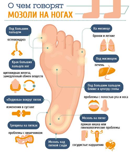 Они образуются в течение длительного времени из-за постоянного повышенного давления на определенный участок кожи или трения. Может возникать на любой части подошвенной поверхности стопы, которая подвергается механическому воздействию: на пальцах, плюсне, пятке (см. причины боли в пятке). Очень редко мозоли возникают на своде стопы.