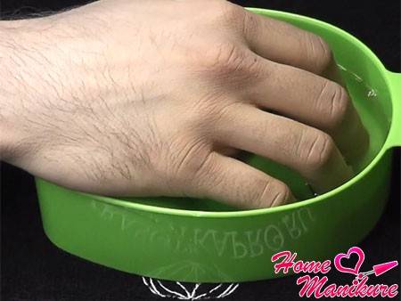 Благотворное воздействие на кожу и ногти оказывает также раствор морской соли. Брутальным мужчинам, для которых использование косметических средств неприемлемо, можно остановиться на самом доступном мыльном растворе либо просто ванночке с горячей водой комфортной температуры. Подготовительный этап занимает около 10-15 минут.