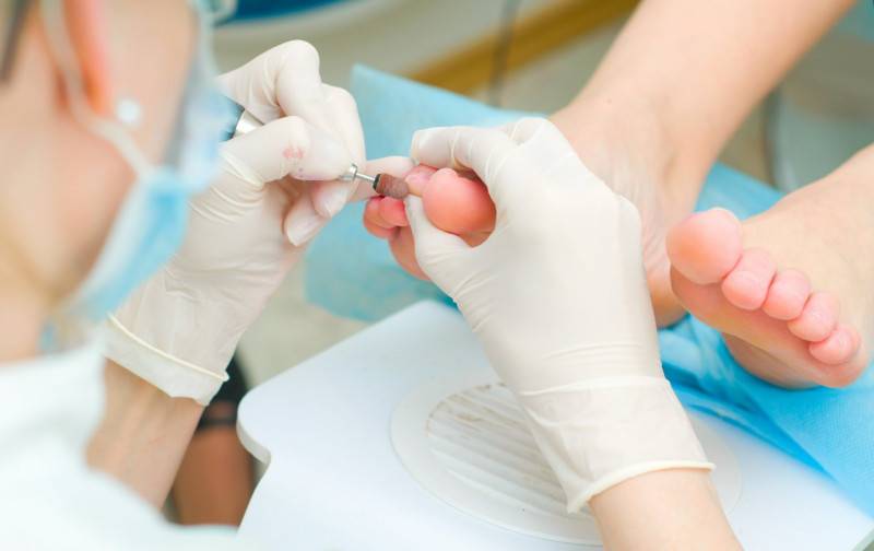 - Обрезание огрубевшей кожи специальным педикюрным станком.
