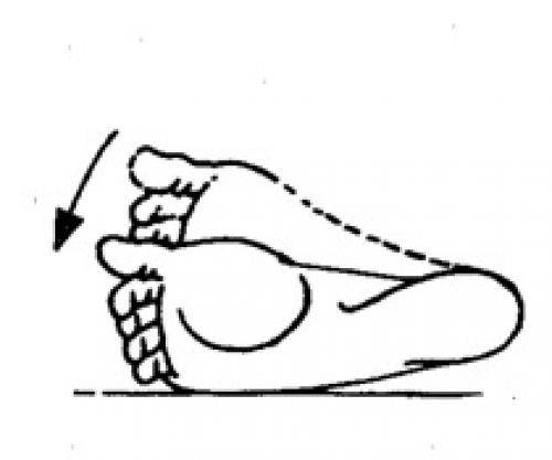 Ногу обоприте на носок. Максимально оттяните носочек ноги и напрягите двуглавую мышцу голени. Сделайте по 10 поворотов пятки влево и вправо. Чтобы быстрее накачать мышцы ступни это упражнение можно выполнять стоя на двух ногах и взяв небольшое отягошение.