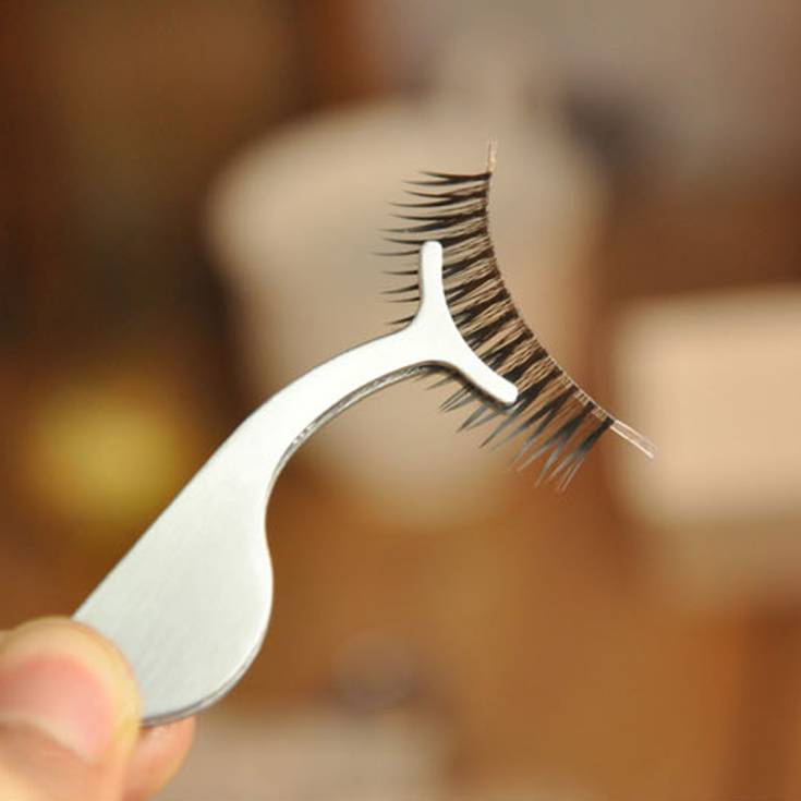 - При помощи пинцета ленту с искусственными волосками примерить к веку. Отрезать у неё лишнюю длину.