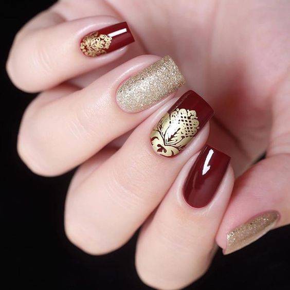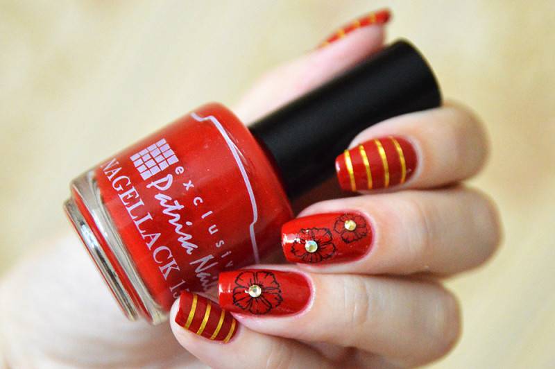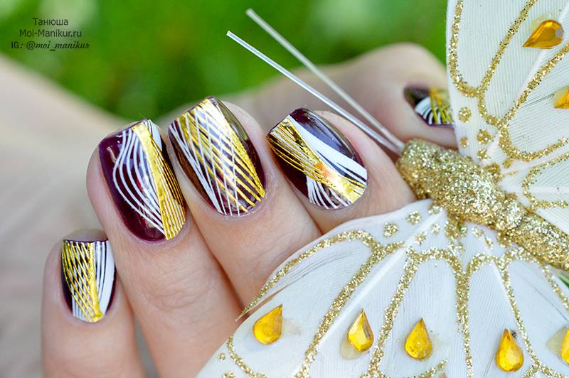 Такие цвета, как белый и золотой из этих наклеек красиво смотрятся на темных цветах подложки. Лично мне очень нравится сочетание золота и бардового цвета, поэтому за основу маникюра я выбрала гель-лак Premiere номер 109 – спелая вишня. На фото он нанесен в два слоя: