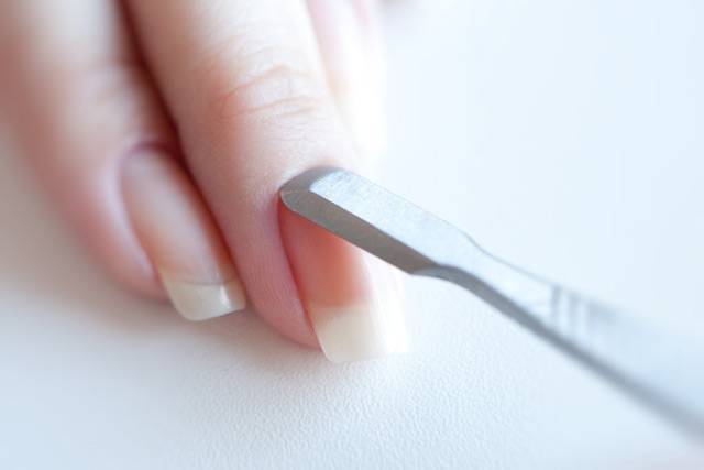 - Подготовить ноготь. Для этого потребуется удалить кутикулу и сделать полировку поверхности баффом для надежного сцепления с пленочным покрытием, а затем обезжирить.