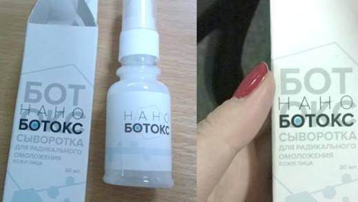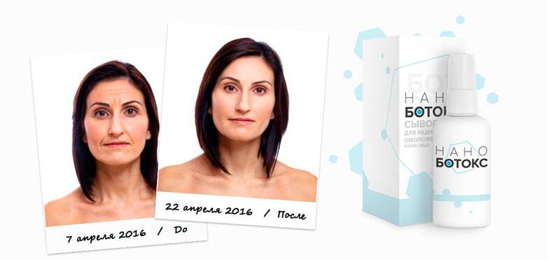 - Новейшая микроэмульсия Нано Ботокс, помогающая от морщин, обладает мгновенным действием. Уже после первого использования вы заметите повышение тургора дермы и исчезновение тонких линий на лице.