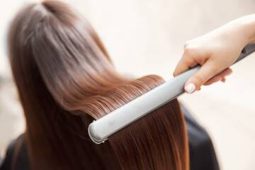 - Мастер расправляет пряди пальцами рук. Волосы разделяют на небольшие пряди, и каждая из них поочередно прогревается утюжком при температуре 180-190 градусов, если пряди окрашены или повреждены. Если локоны достаточно жесткие, температура может повышаться до 200-220 градусов.