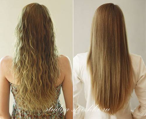 Во втором случае проводят выпрямление, разглаживание. Результат – прямые, гладкие пряди, даже если ранее они были слишком пушистые, завивались от природы.