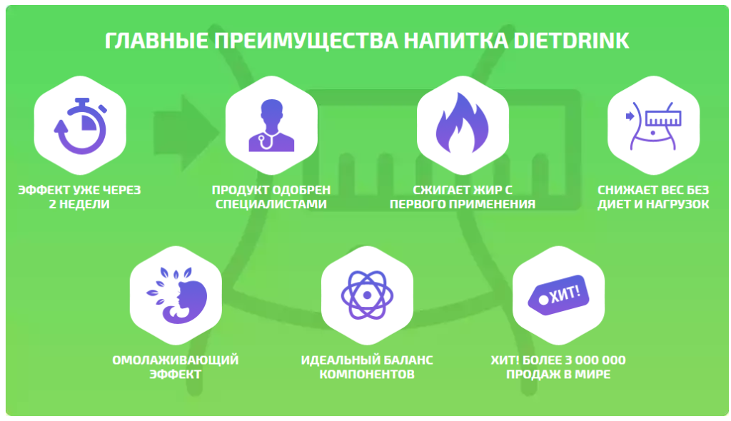 DietDrink для похудения не просто эффективен, он имеет комплексное воздействие на все области, являющиеся причиной полноты и больших объемов