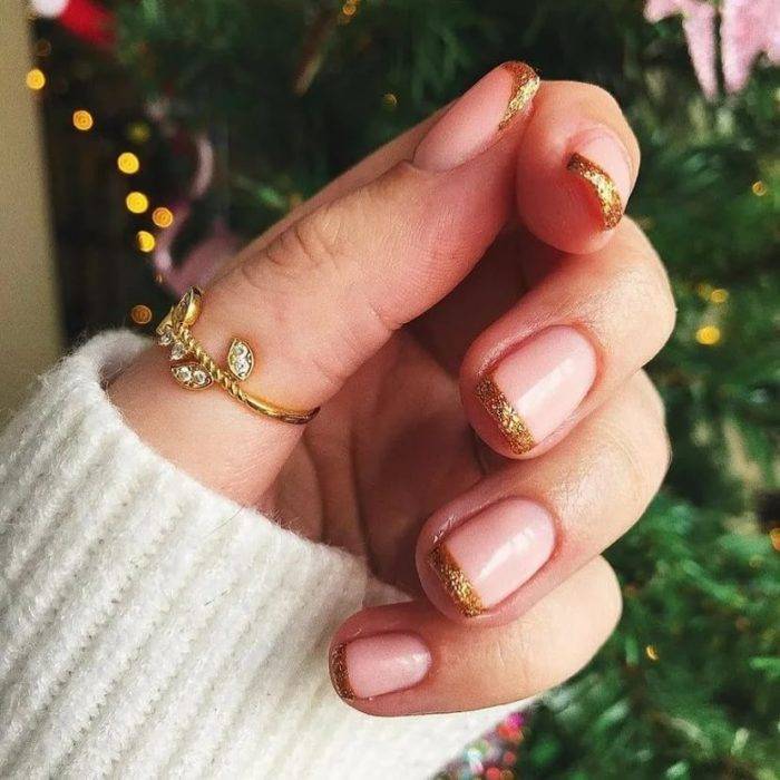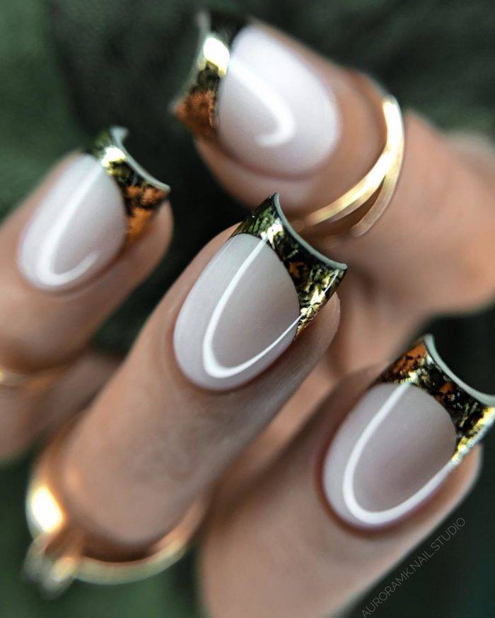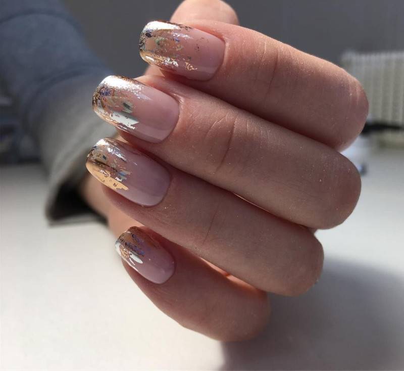 Современность предлагает не только традиционные оттенки. Появились новые предложения: розовое золото, тусклое золото. Такой френч можно достаточно аккуратно нанести и для повседневного варианта.