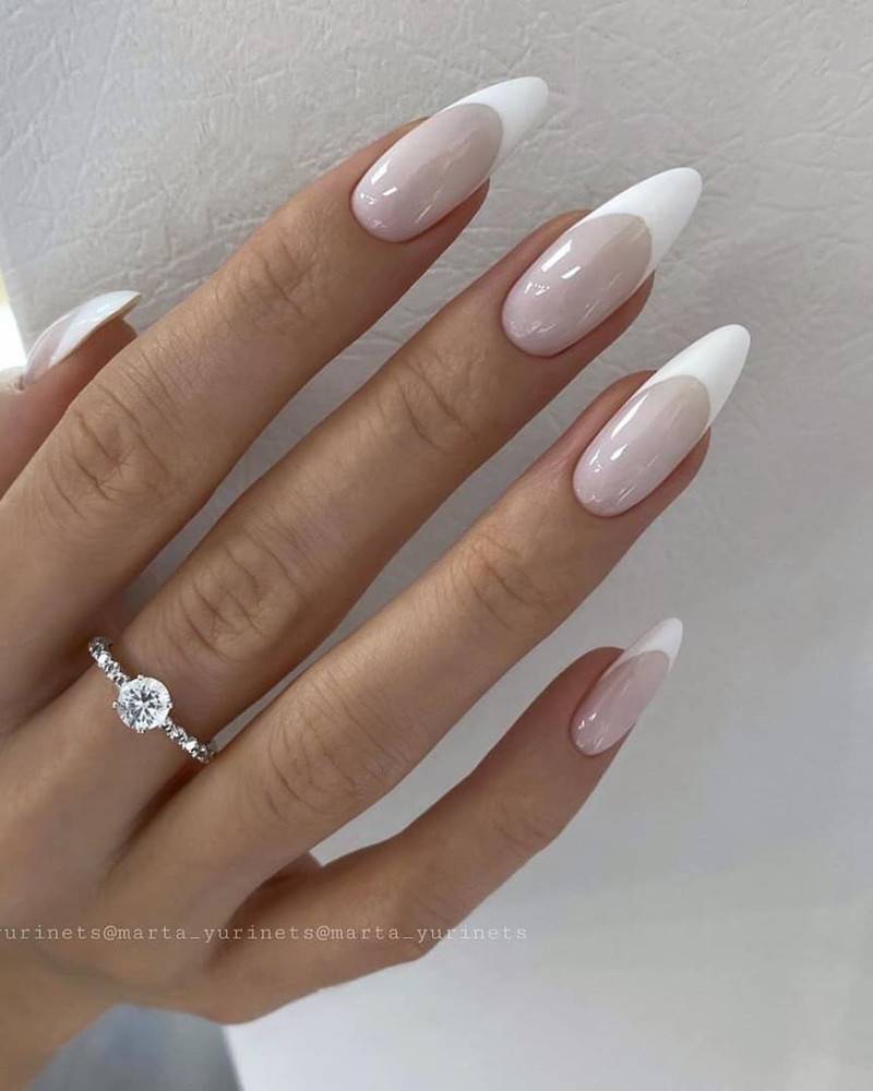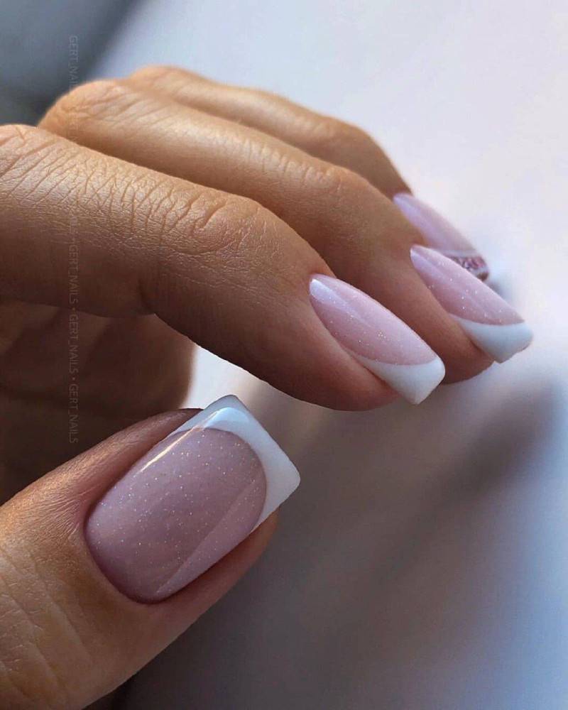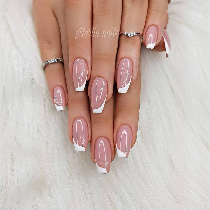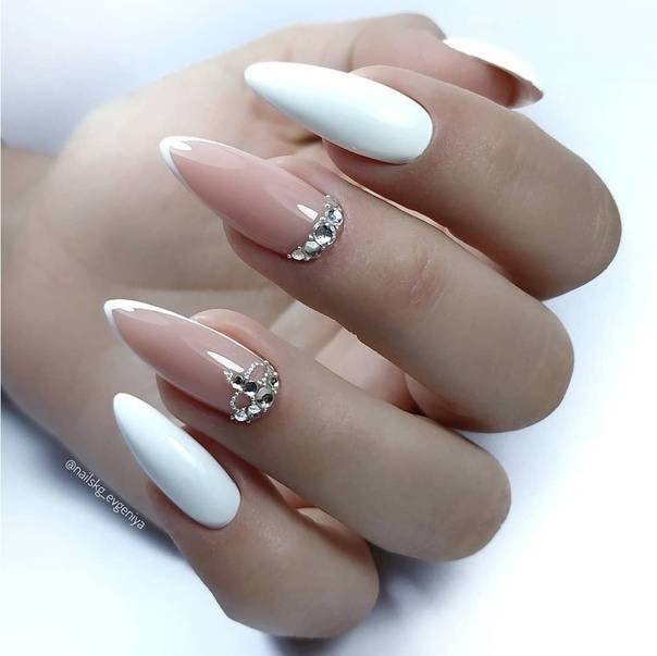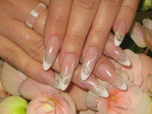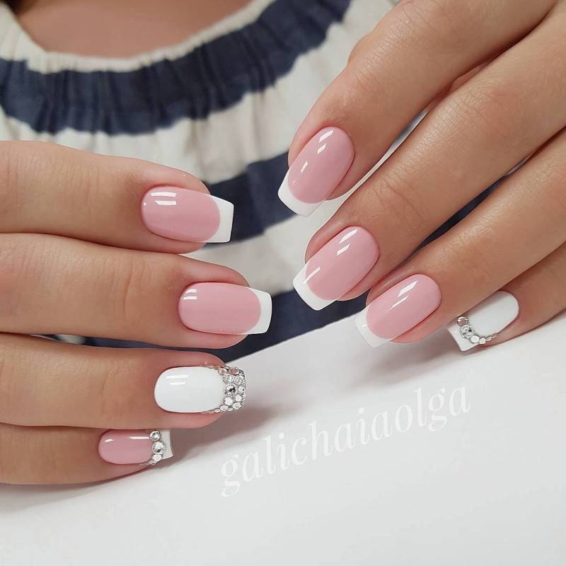 Ногти, наращенные для дизайна в стиле френч, могут быть острые, овальные, квадратные или миндалевидные. Независимо от формы, ногти френч-стиля можно оформлять с использованием различных материалов и воплощать в их дизайне самые разнообразные идеи. Французский маникюр уже давно перестал быть классическим, и даже если он выполняется в виде стандартного белого кончика, модницы стремятся украсить его стразами. Такой вариант является сдержанным, но и отличается тонкой оригинальностью, являясь универсальным для различных жизненных событий.