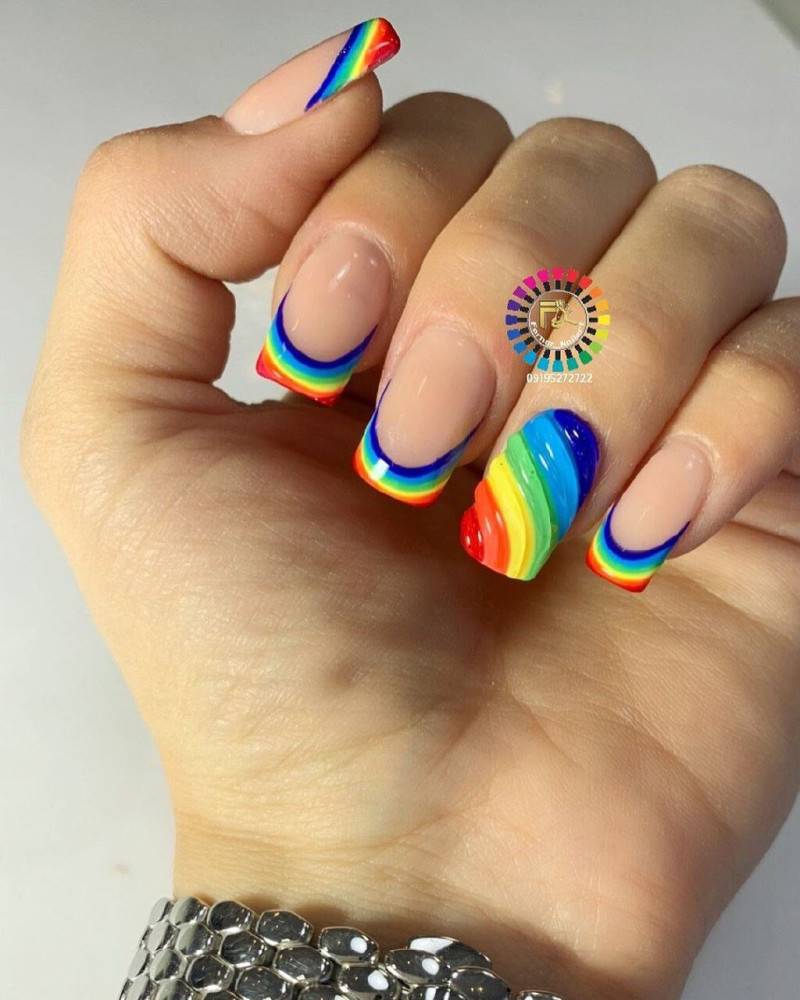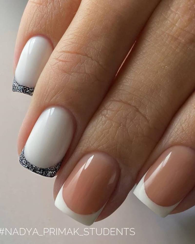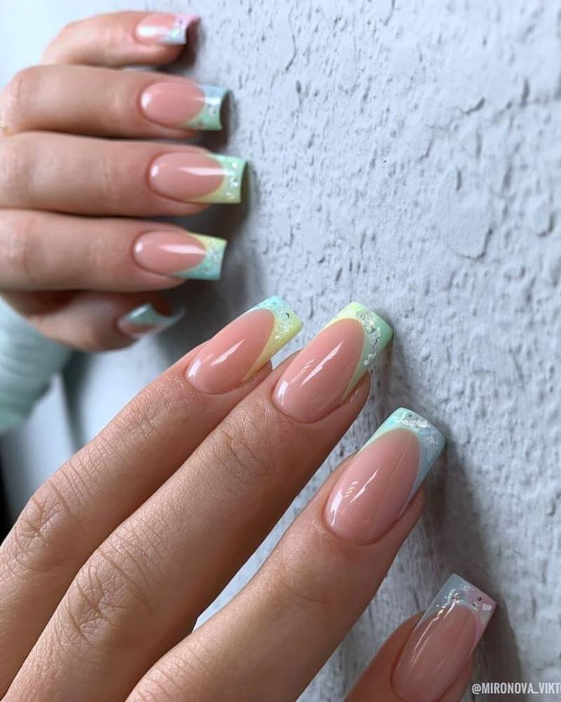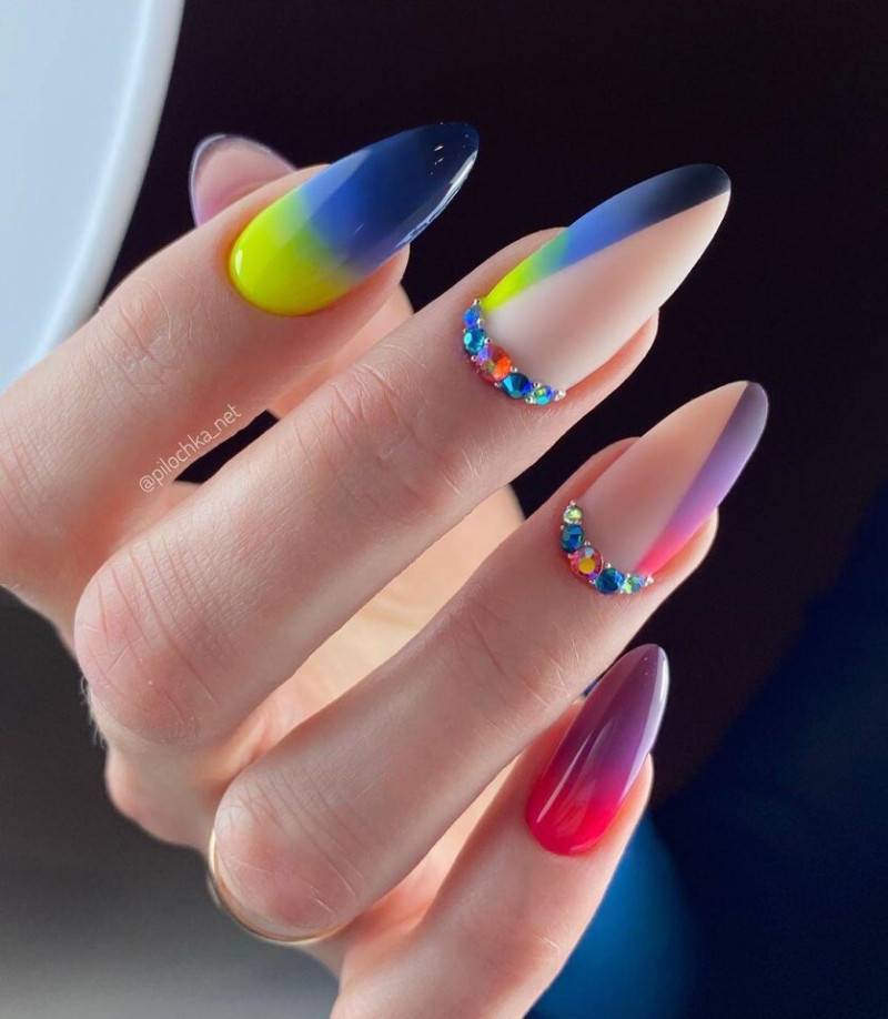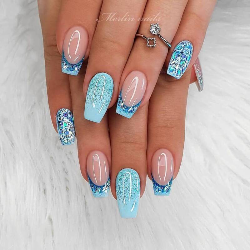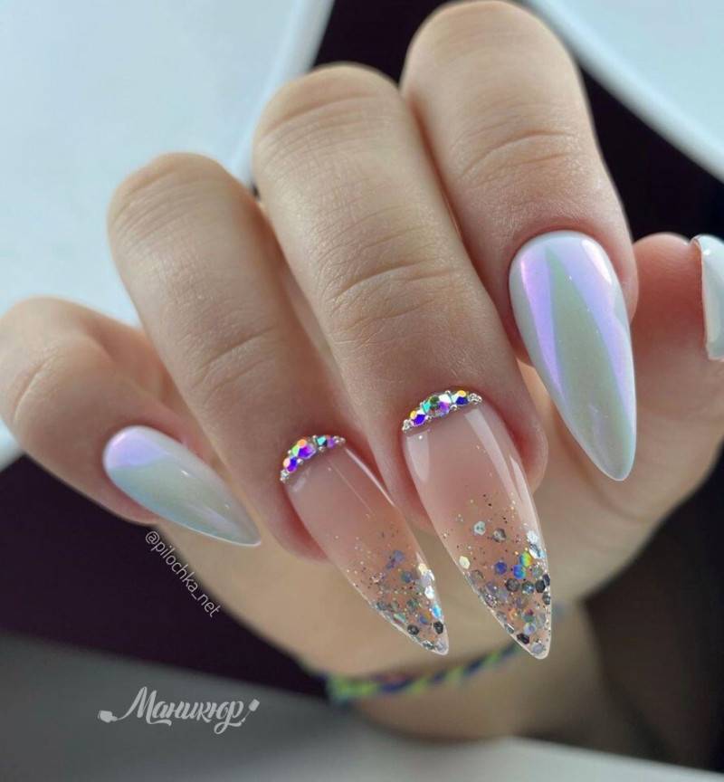 Когда дело доходит до французского маникюра, радужные и модные украшения были и будут. Маникюр в светлых оттенках прекрасно впишется в повседневные луки и разнообразит их. Глубокие оттенки и насыщенные оттенки пайеток сделают дизайн роскошным и элегантным, идеальным для вечернего выхода. Чаще всего для оформления самой улыбки используют глиттер, ведь такой вариант выглядит ярко и привлекательно.