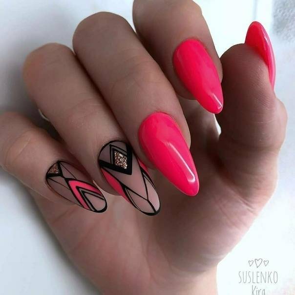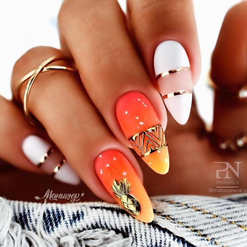 Стоит обратить внимание на градиент, который переходит от одного ногтя к другому, или же геометрические мотивы в виде разных фигур и иероглифов, которые будут выглядеть уместно при любой длине