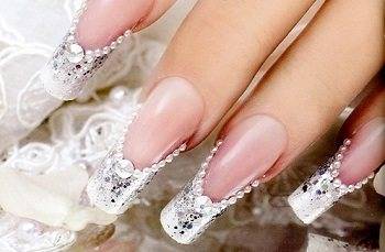 Краешек ногтя делается большим и украшается различными дополнительными материалами. Для украшений берется искусственный жемчуг, бусинки, стразы или фигурки из полимерной глины.
