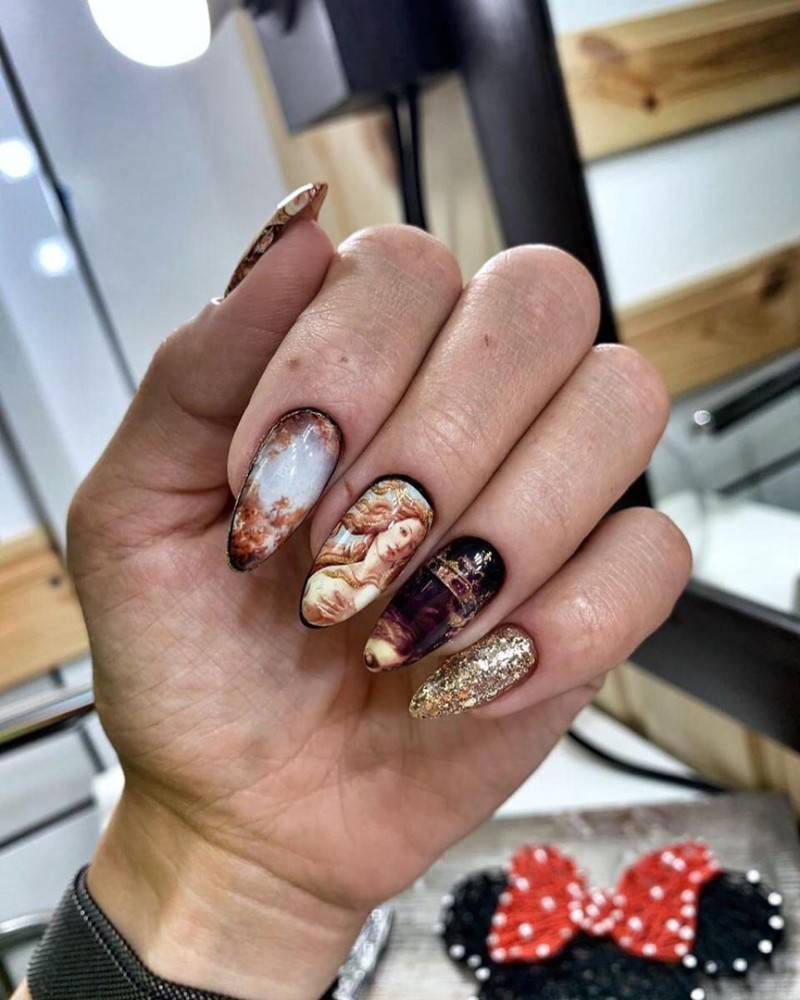 Не обошел его своим вниманием и найл-арт. Преимущественно такой маникюр используют на праздничных мероприятиях, чтобы подчеркнуть торжественность момента