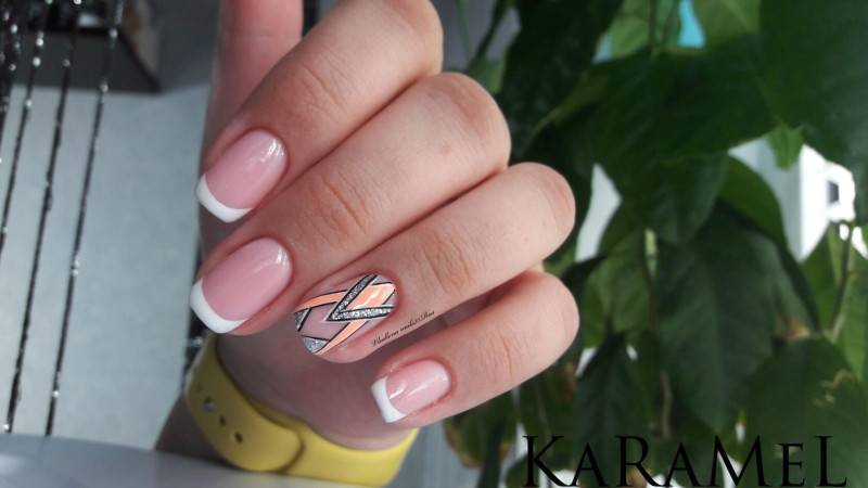 Вариант, когда френч маникюр украшается различными геометрическими фигурами, также прекрасен. Ногтевая пластина с такими рисунками всегда выглядеть великолепно.