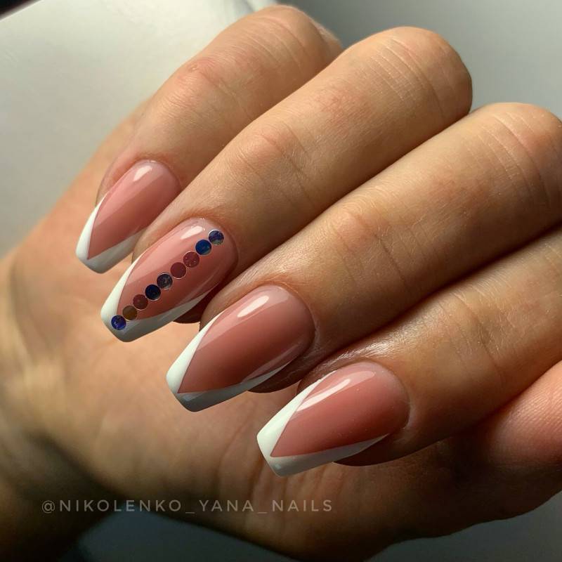 Элемент френча не обязательно может быть ровным. Для разнообразия стоит попробовать треугольники.