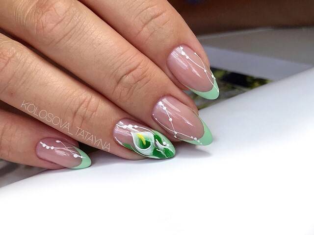 - Френч-рисованный лаком. Данный способ предполагает наращивание ногтей естественного цвета, на которых затем можно делать любые покрытия лаком, а также рисунки.