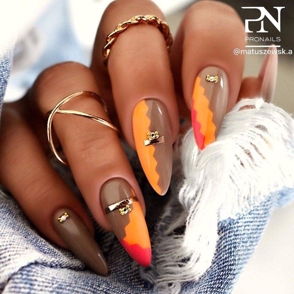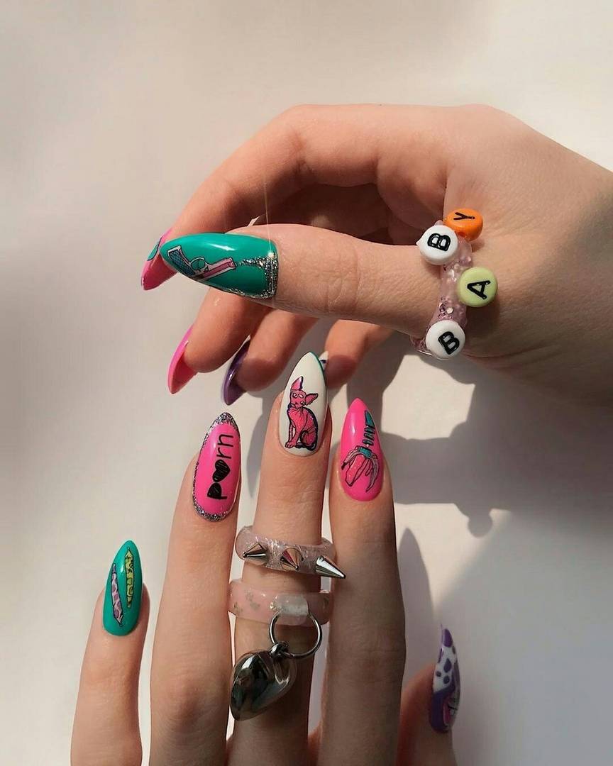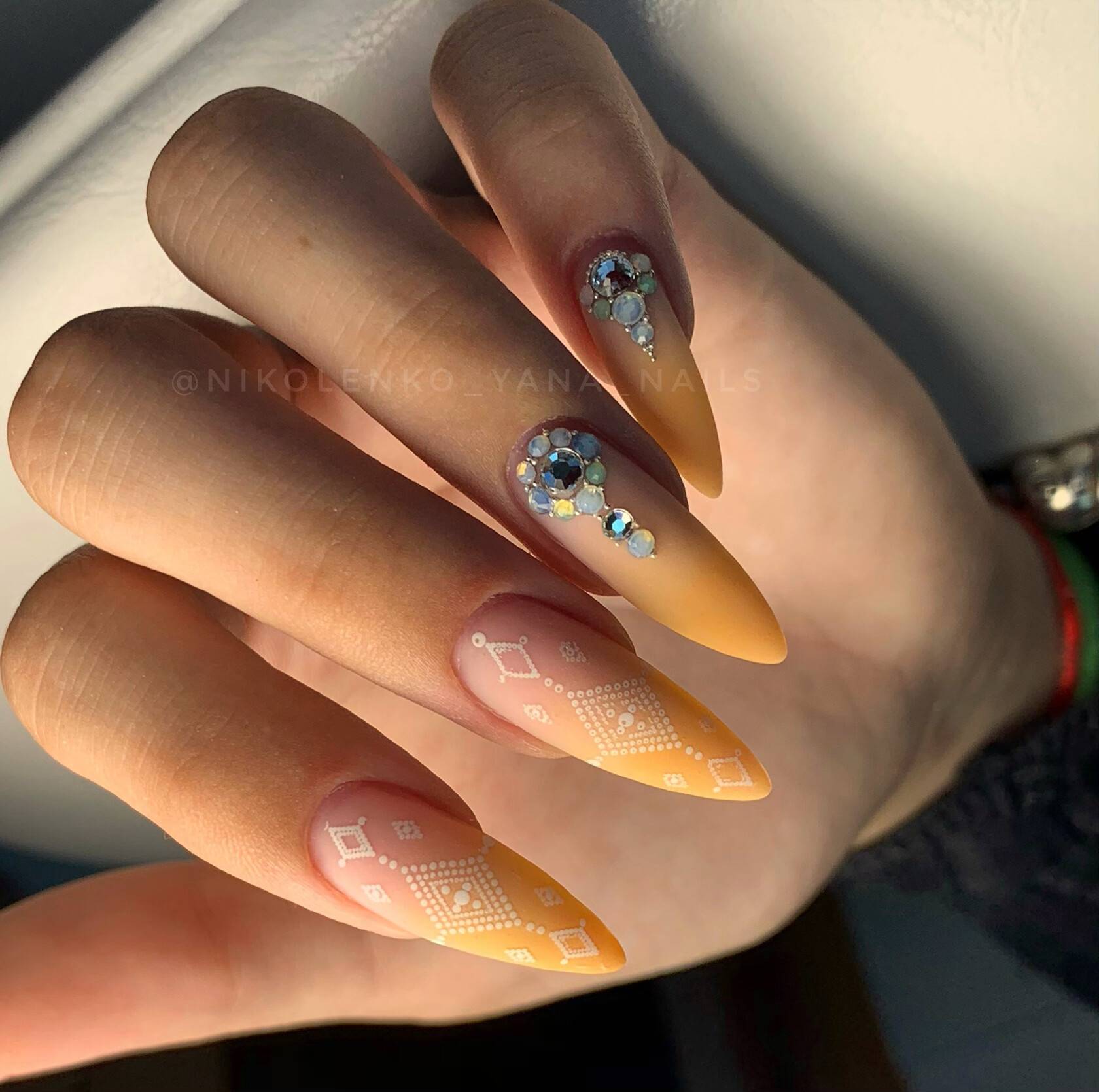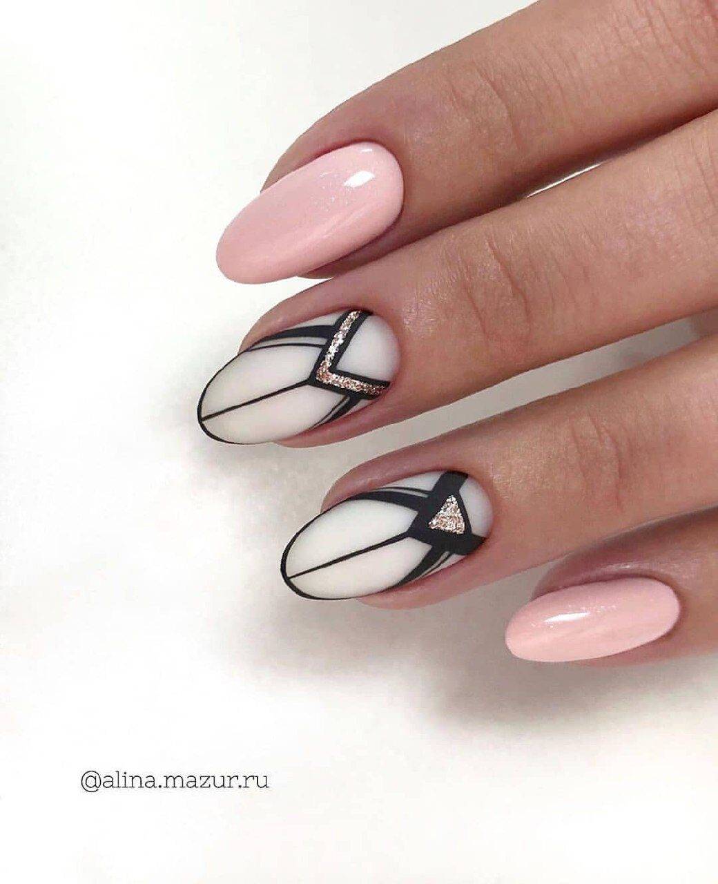 Стоит обратить внимание на градиент, который переходит от одного ногтя к другому, или же геометрические мотивы в виде разных фигур и иероглифов, которые будут выглядеть уместно при любой длине