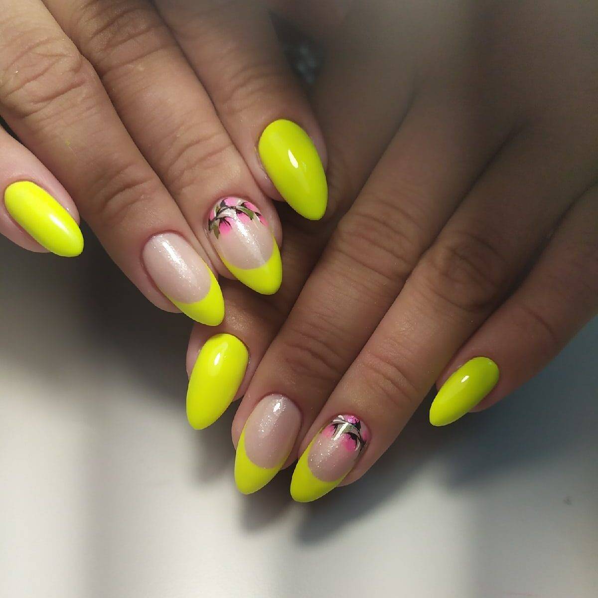 Остается актуальным маникюр френч в неоновых тонах, особенно в летний период. Хит сезона — яркие оттенки желтого, лимонного цвета.