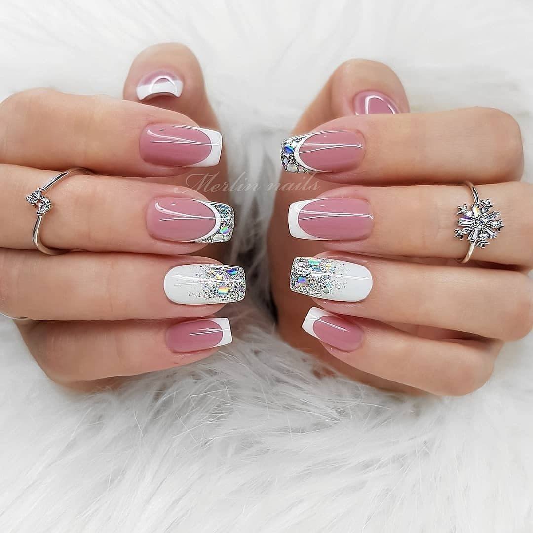 Когда дело доходит до французского маникюра, радужные и модные украшения были и будут. Маникюр в светлых оттенках прекрасно впишется в повседневные луки и разнообразит их. Глубокие оттенки и насыщенные оттенки пайеток сделают дизайн роскошным и элегантным, идеальным для вечернего выхода. Чаще всего для оформления самой улыбки используют глиттер, ведь такой вариант выглядит ярко и привлекательно.