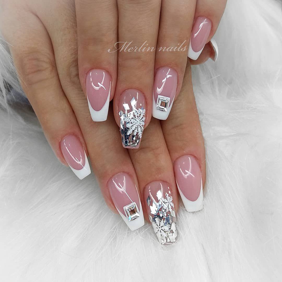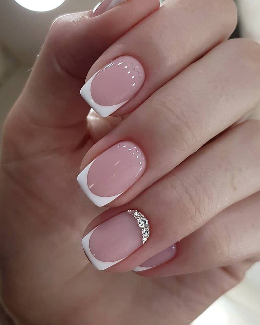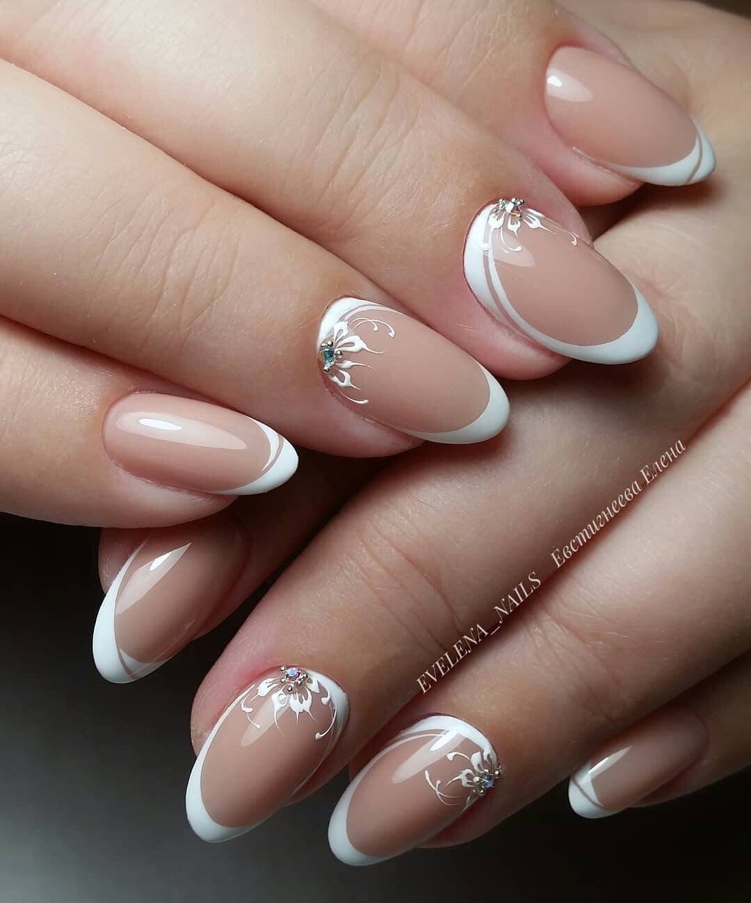 Ногти, наращенные для дизайна в стиле френч, могут быть острые, овальные, квадратные или миндалевидные. Независимо от формы, ногти френч-стиля можно оформлять с использованием различных материалов и воплощать в их дизайне самые разнообразные идеи. Французский маникюр уже давно перестал быть классическим, и даже если он выполняется в виде стандартного белого кончика, модницы стремятся украсить его стразами. Такой вариант является сдержанным, но и отличается тонкой оригинальностью, являясь универсальным для различных жизненных событий.