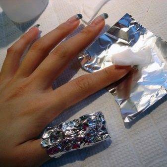 На втором этапе снятие отличается технологией, для акрила и геля она разная. Если это акриловые ноготки, то их вначале размягчают. Для этого предварительно подготавливают 10 ватных тампонов и обильно смачивают их в ацетоне. Тампоны прикладывают на каждую пластинку и закрепляют фольгой, обматывая края пальчиков. Через час акрил приобретёт структуру желе и его нужно сразу же очищать, иначе он повторно затвердеет.